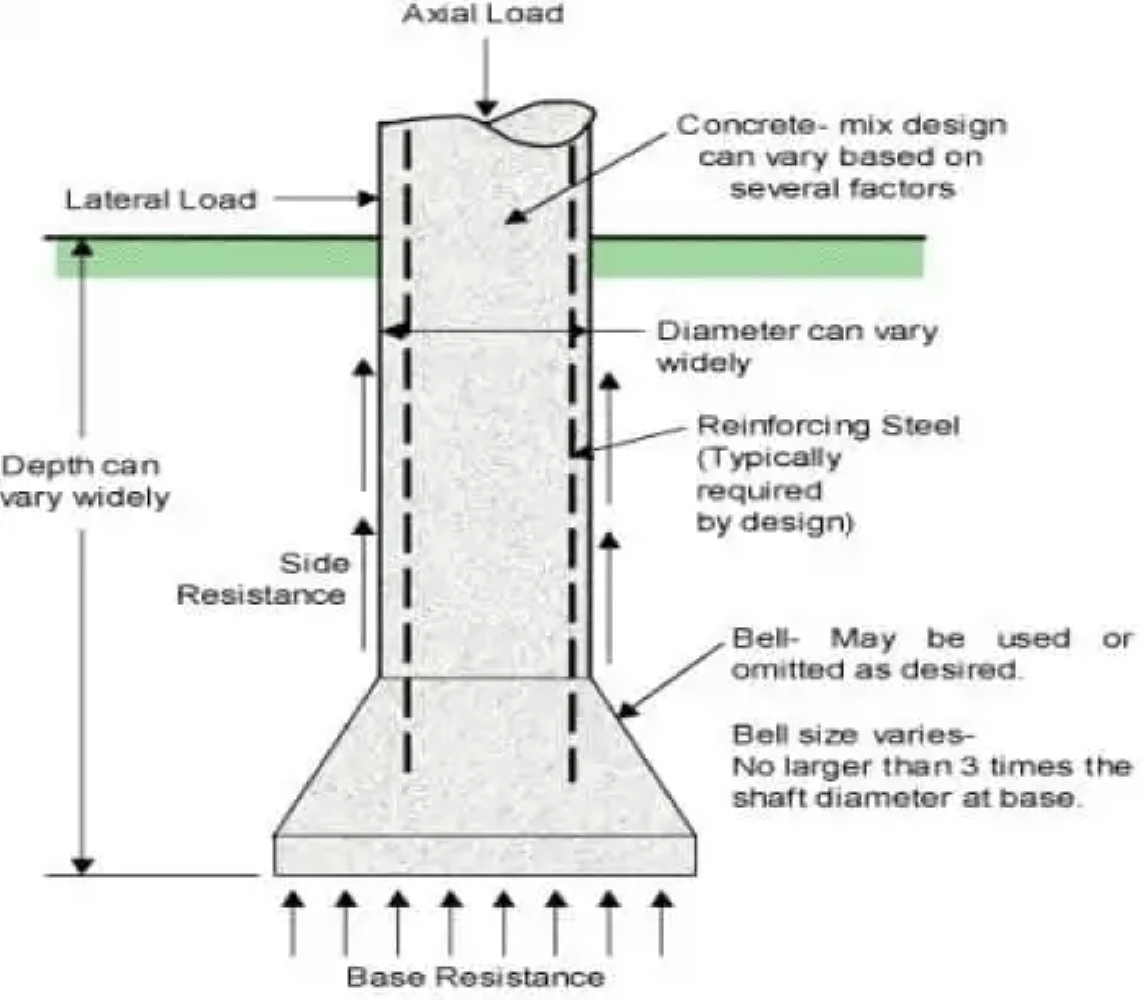 Heavy steel reinforced concrete structures that penetrate deep into the earth to reach stable load bearing soil. Caissons require extensive excavation and concrete curing times.