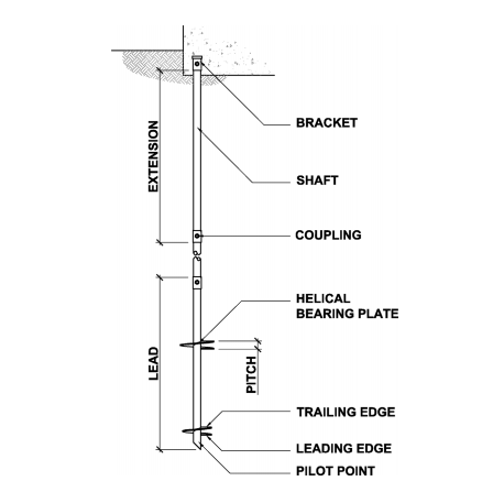 Galvanized steel posts with angled helical plates that can be screwed deep into the earth to reach stable load bearing soil. Load bearing strength can be calculated through the torque required to drive the pier. Requires no excavation or cure time.